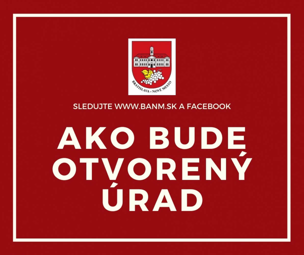 Dôležitá informácia! Z dôvodu horúčav a mimoriadnej zát‘aže teplom, s prihliadnutím na ochranu zdravia zamestnancov pred poškodením v zmysle Vyhlášky Ministerstva zdravotníctva Slovenskej republiky o podrobnostiach o ochrane zdravia pred zát‘ažou teplom a chladom pri práci, sa dnes (pondelok 27. júna) upravuje základný pracovný čas pracovníkom na Miestnom úrade Bratislava-Nové Mesto nasledovne: od 8.00 do 15.00 hod., bez zmeny stránkových hodín. Na pracovisku, ktoré zabezpečuje stránkové hodiny úradu bude zabezpečený jeden zamestnanec pre fyzický kontakt so stránkami, alebo aj pre telefonický kontakt.