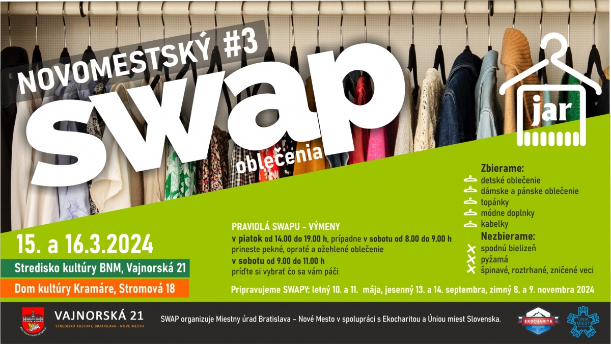 Podľa informácií Štatistického úradu Slovenskej republiky sa na území Hlavného mesta SR Bratislavy v roku 2021 vyhodilo vyše 140 ton šatstva a ďalších takmer 60 ton textílií. Oblečenie tak nielenže končí zbytočne v koši, ale produkty tzv. fast fashion (rýchla móda) škodia životnému prostrediu už pri samotnej výrobe. Aj to sú dôvody, pre ktoré sa mestská časť Bratislava-Nové Mesto spoločne s partnermi Ekocharita a Únia miest Slovenska rozhodli usporiadať Novomestský SWAP oblečenia.