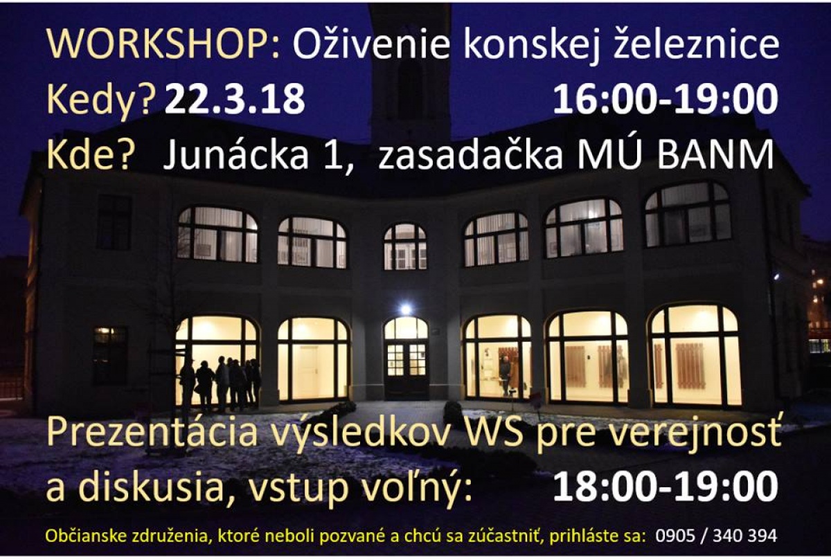 21.03.2018 - Mestská časť Bratislava-Nové Mesto vás pozýva na workshop zameraný na oživenie budovy stanice Konskej železnice, ktorý sa uskutoční vo štvrtok 22.3.2018 od 16:00 do 19:00 hod. v zasadačke č. 619 na Miestnom úrade Bratislava - Nové Mesto.