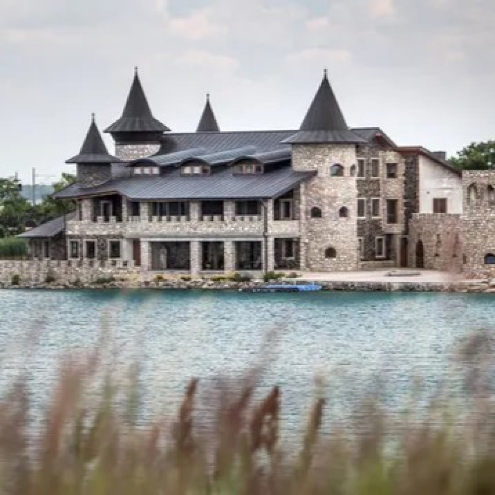 foto: Denník N, najznámejšia čierna stavba podnikateľa Cyrila Talapku, Reca pri Senci. Obrovský hrad s vlastným jazierkom dokonca zasahuje na pozemky železníc.