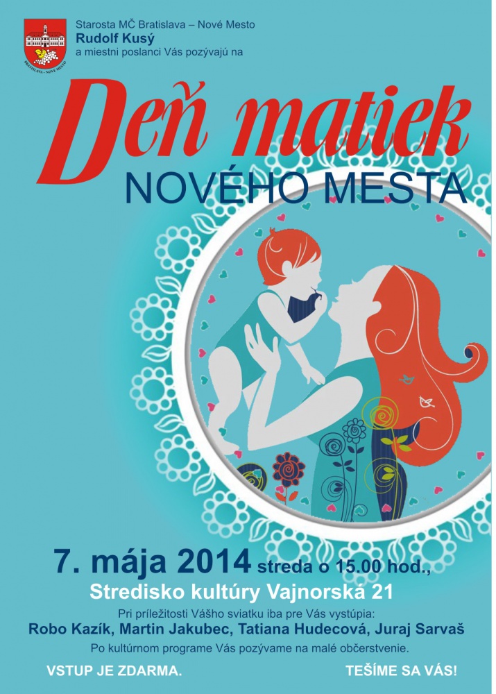 02.05.2014 - Streda 7. mája bude patriť všetkým novomestským mamám. Mestská časť pre nich pripravila DEŇ MATIEK NOVÉHO MESTA, v rámci ktorého iba pre ne vystúpia v Stredisku kultúry na Vajnorskej 21 speváci Robo Kazík, Martin Jakubec, talentovaná Tatiana Hudecová a známy herec a recitátor Juraj Sarvaš. Program sa začína o 15.00 hod.