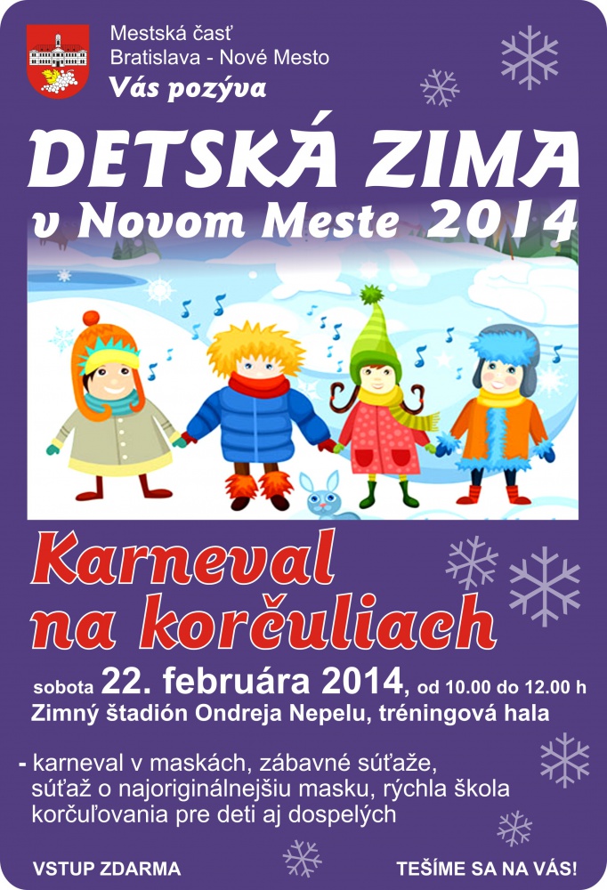 Už túto sobotu – 22. februára 2014 – sa stretneme na klzisku! Mestská časť Bratislava - Nové Mesto vás pozýva na novomestský KARNEVAL NA KORČULIACH. Od 10.00 do 12.00 h bude tréningová hala Zimného štadióna Ondreja Nepelu patriť deťom v maskách. Pripravené budú zábavné súťaže, zapojte sa aj do súťaže o najoriginálnejšiu masku. Deťom aj dospelým sa budú venovať aj inštruktori v rýchlej škole korčuľovania.