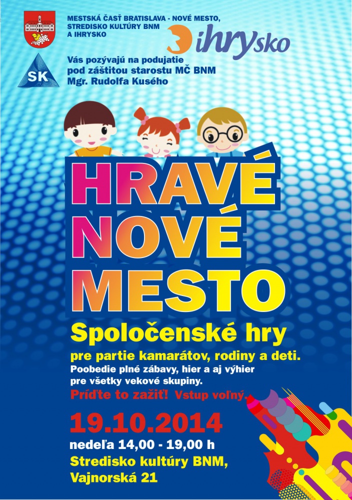 14.10.2014 - Hráte radi spoločenské hry? Už na túto nedeľu 19. októbra sme pre vás pripravili špecializované podujatie s názvom HRAVÉ NOVÉ MESTO. Stretneme sa od 14.00 hod. vo veľkej sále Strediska kultúry na Vajnorskej ulici č. 21. Pripravené bude množstvo skvelých spoločenských hier pre partie kamarátov, rodiny a deti.