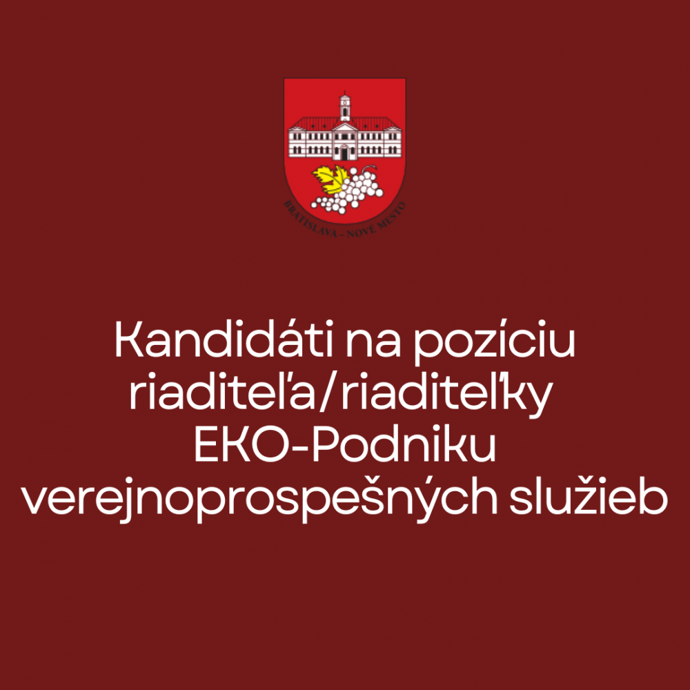 Mestská časť Bratislava-Nové Mesto zároveň oznamuje, že osobné vypočutie kandidátov na pozíciu „Riaditeľ/Riaditeľka EKO-podniku verejnoprospešných služieb“ sa uskutoční 5. júna 2024 od 17:00 hod.