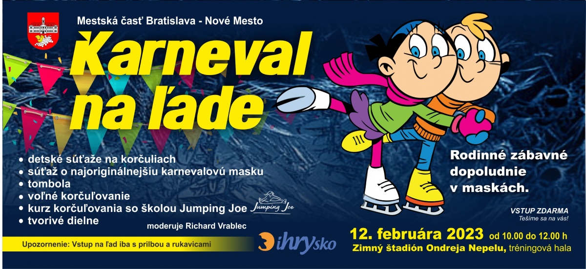 Karneval na ľade organizuje Mestská časť Bratislava – Nové Mesto v nedeľu 12. februára v čase od 10:00 do 12:00 v tréningovej hale na Štadióne Ondreja Nepelu. Vstup na ľadovú plochu iba s prilbou a rukavicami.