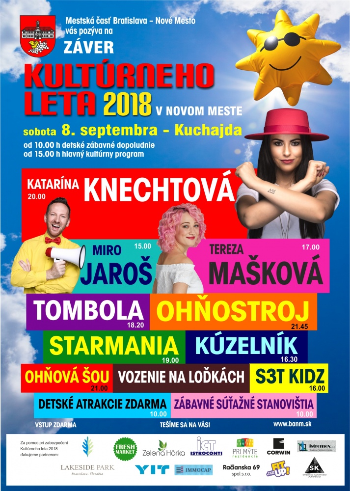 30.08.2018 - Máme za sebou ďalšie krásne leto plné zábavy, kultúry, športu a zážitkov. V sobotu 8. septembra sa s ním rozlúčime v rámci tradičného Záveru Kultúrneho leta v Novom Meste. Pripravili sme pre vás opäť bohatý celodenný program na Kuchajde.