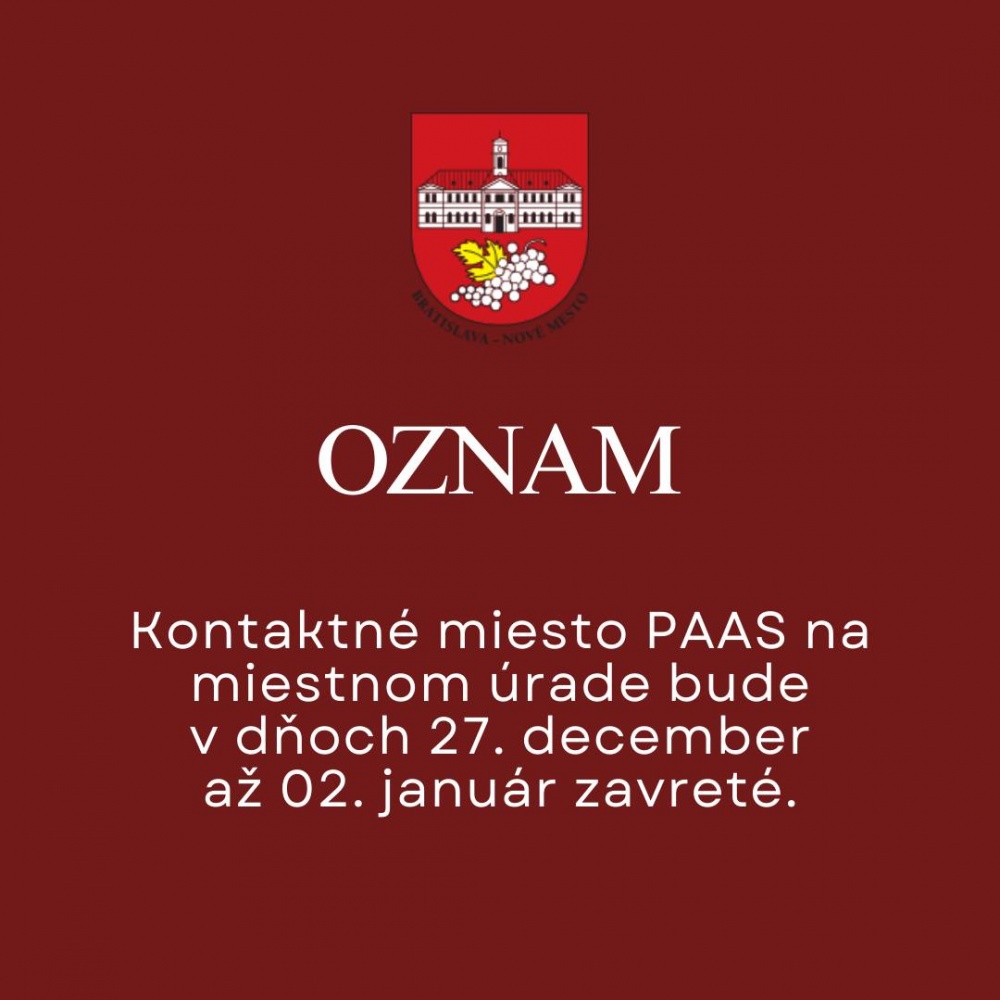 22.12.2023 - Milé Novomešťanky a Novomešťania, dovoľujeme si vám oznámiť, že počas vianočných a novoročných sviatkov bude kontaktné miesto PAAS na Miestnom úrade Bratislava-Nové Mesto zavreté od 27. decembra do 2. januára.