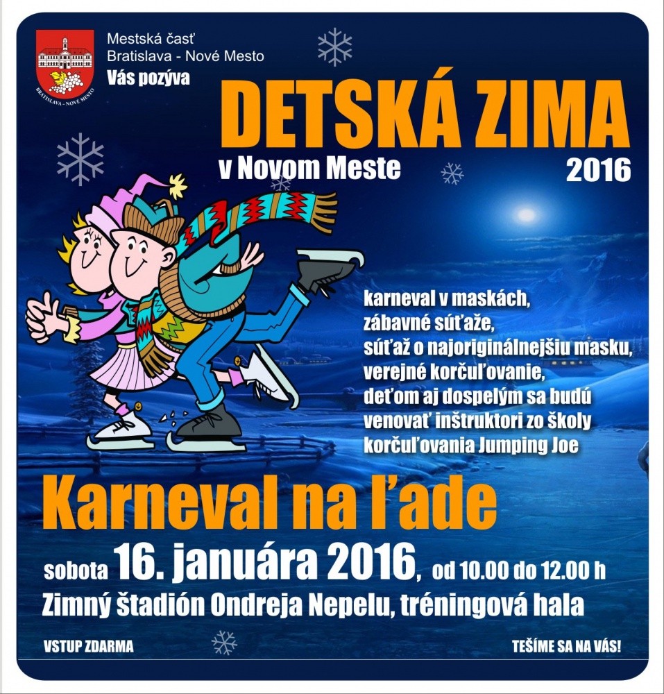 08.01.2016 - Mestská časť Bratislava – Nové Mesto pozýva všetky deti a rodičov na zábavné víkendové dopoludnie na korčuliach! V sobotu 16. januára 2016 sme pre vás pripravili KARNEVAL NA ĽADE. Stretneme sa od 10.00 hod. v tréningovej hale Zimného štadióna Ondreja Nepelu, bohatý program potrvá až do 12.00 hod.