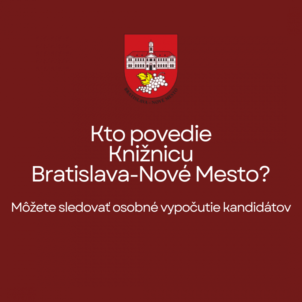 Mestská časť Bratislava-Nové Mesto oznamuje, že dňa 29.02.2024 (štvrtok) od 16:30 hod. sa uskutoční osobné vypočutie na pozíciu „Riaditeľ/Riaditeľka Knižnice Bratislava-Nové Mesto“.