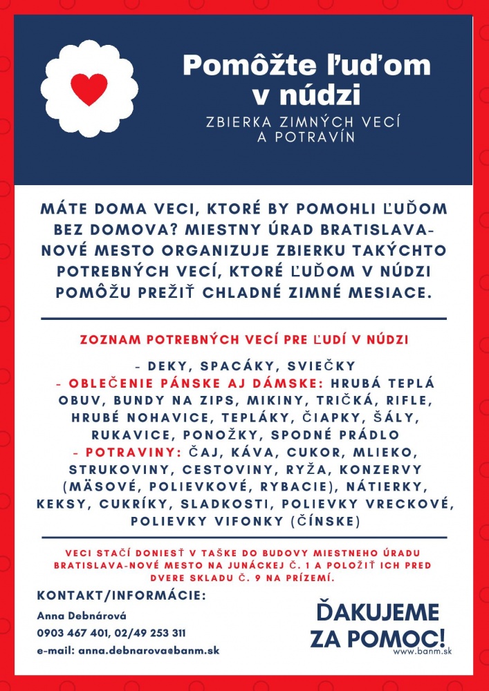 Máte doma veci, ktoré by pomohli ľuďom bez domova? Miestny úrad Bratislava-Nové Mesto organizuje zbierku takýchto potrebných vecí, ktoré týmto ľuďom v núdzi pomôžu prežiť chladné zimné mesiace.