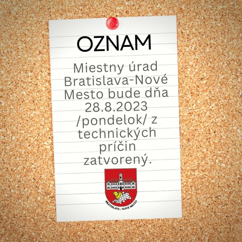 Miestny úrad Bratislava-Nové Mesto bude v pondelok 28. augusta 2023 z technických príčin zatvorený