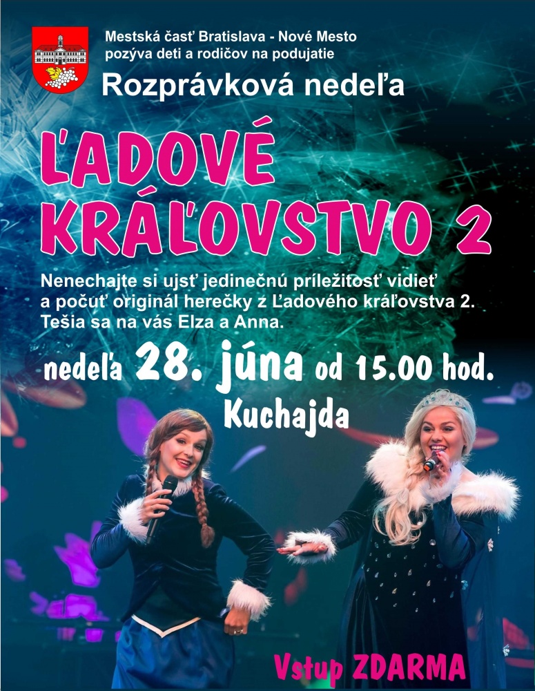 26.06.2020 - Priatelia, máte už program na túto nedeľu? Ak nie, my ho pre vás máme – vezmite deti na ROZPRÁVKOVÚ NEDEĽU NA KUCHAJDE! Pripravili sme pre vás darček k nedávnemu Dňu detí – pokračovanie kultovej hudobnej rozprávky ĽADOVÉ KRÁĽOVSTVO 2! Nenechajte si ujsť jedinečnú príležitosť vidieť a počuť populárnu Elzu a Annu v podaní slovenských herečiek a speváčok z tohto skvelého muzikálu. Okrem legendárnej Frozen vám zaspievajú aj hity z ďalších obľúbených rozprávok.