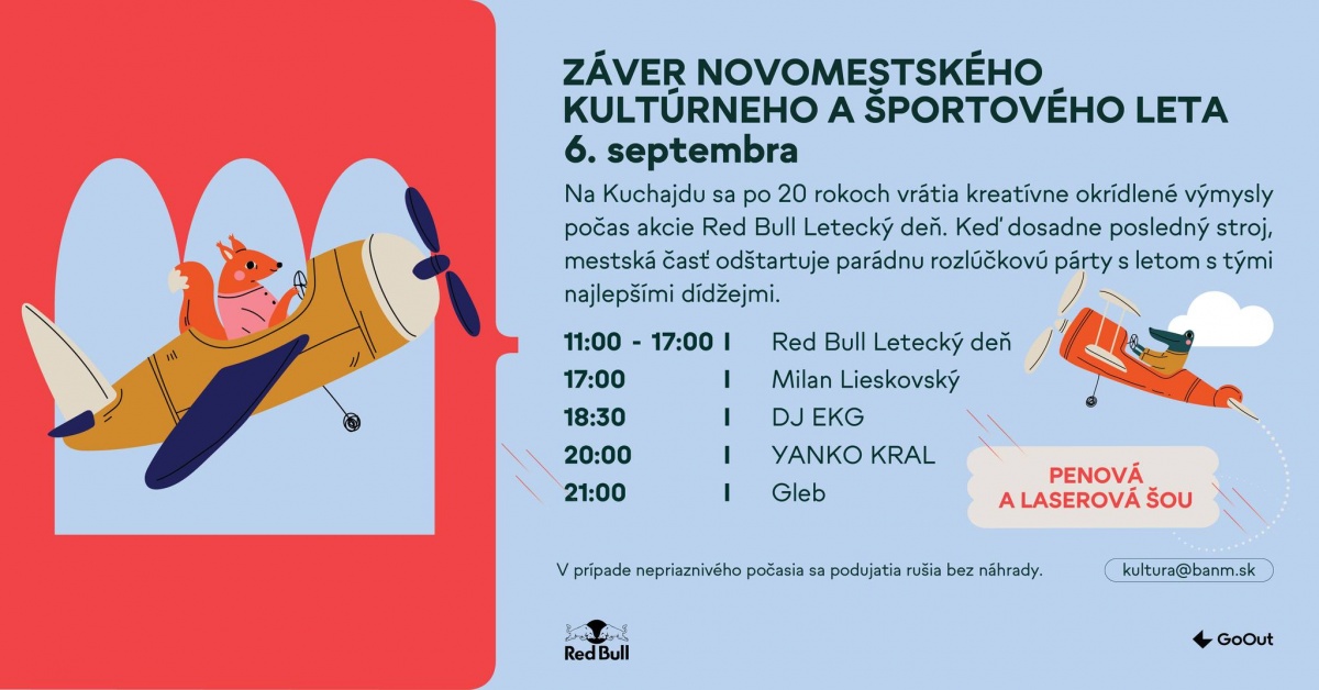 Program poslednej udalosti letného kultúrneho a športového diania v Novom Meste odštartuje o 11:00 podujatie Redbull Letecký deň s moderátormi Adelou a Sajfom. Na Kuchajdu sa po dlhých rokoch vrátia okrídlené výmysly, s ktorými si ich autori trúfnu vzlietnuť, alebo aspoň odvážne spadnúť rovno do vody. Uvidíte vynálezy, ktoré by neprešli žiadnou STK, no je v nich kopa fantázie tvorcov z 33 tímov, ktorí osobne predvedú, že pokúšať sa lietať je stále veľkým snom človeka.