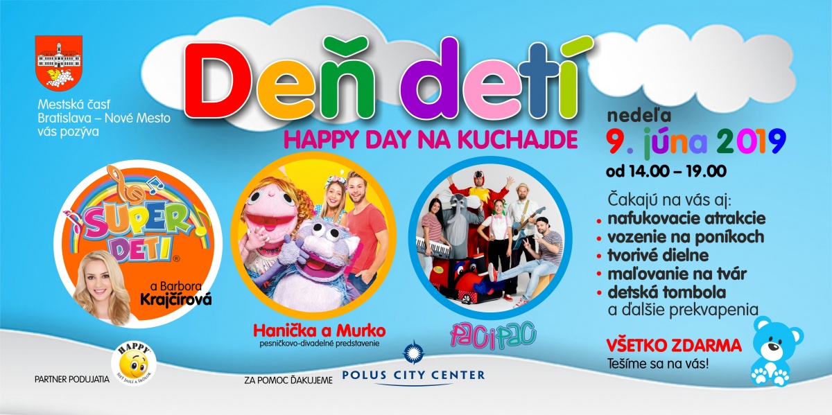 16.05.2019 - Najväčšia detská párty, akú kedy Kuchajda zažila!  Mestská časť Bratislava-Nové Mesto vás v spolupráci s detskými jaslami a škôlkami HAPPY pozýva na DEŇ DETÍ - Happy day na Kuchajde so skvelým programom s detskými hviezdami a atrakciami.