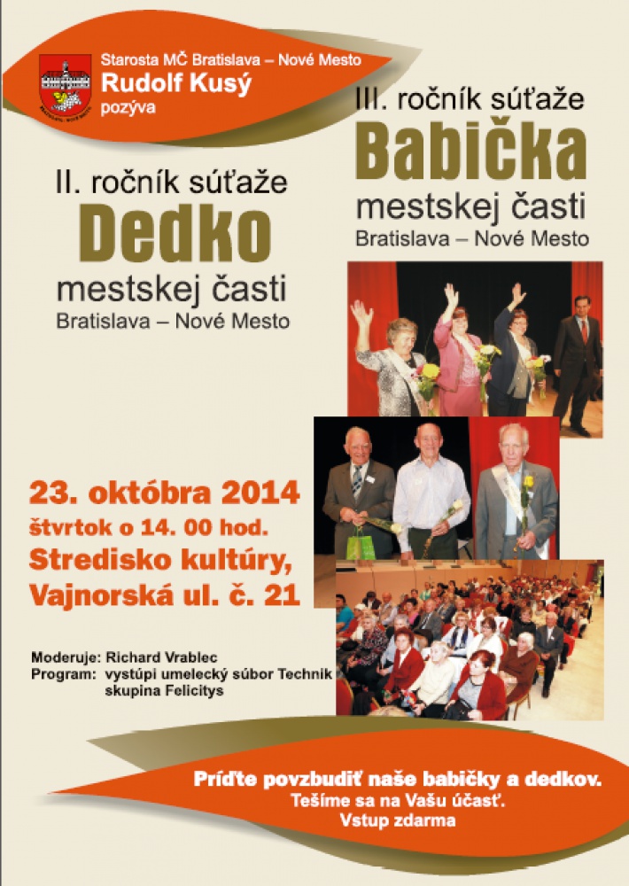 Vo štvrtok 23. októbra spozná mestská časť Bratislava - Nové Mesto svoju naj babičku a dedka roku 2014. Finále súťaže sa bude konať vo veľkej sále Strediska kultúry na Vajnorskej ulici č. 21 o 14.00 hod.