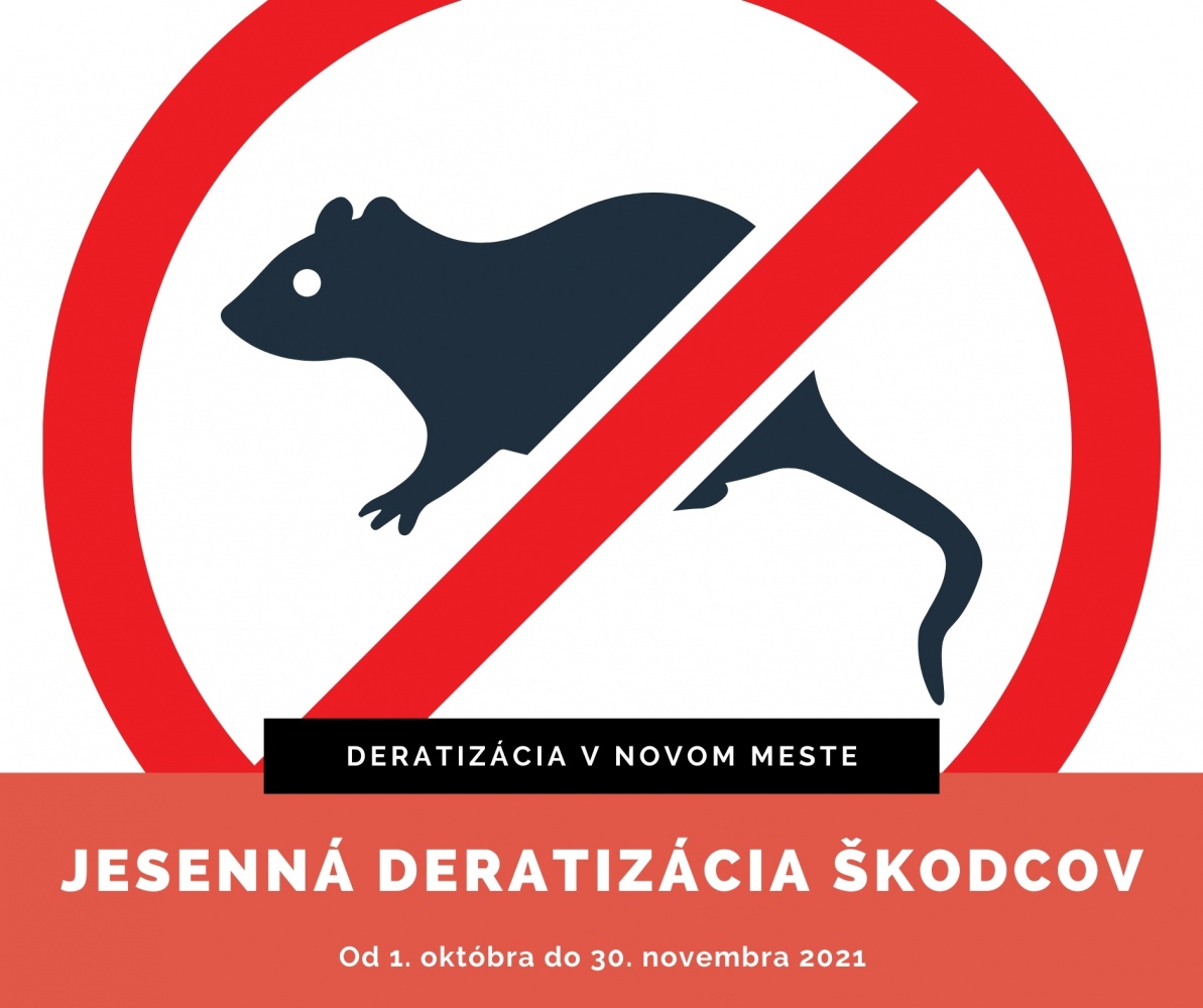 Mestská časť Bratislava – Nové Mesto oznamuje, že na základe výzvy Regionálneho úradu verejného zdravotníctva Bratislava bude v termíne od 1. októbra do 30. novembra 2021 uskutočnená celoplošná jesenná deratizácia s cieľom regulácie živočíšnych škodcov. Deratizáciu verejných priestranstiev v našej mestskej časti zabezpečíme prostredníctvom odborne spôsobilej firmy.