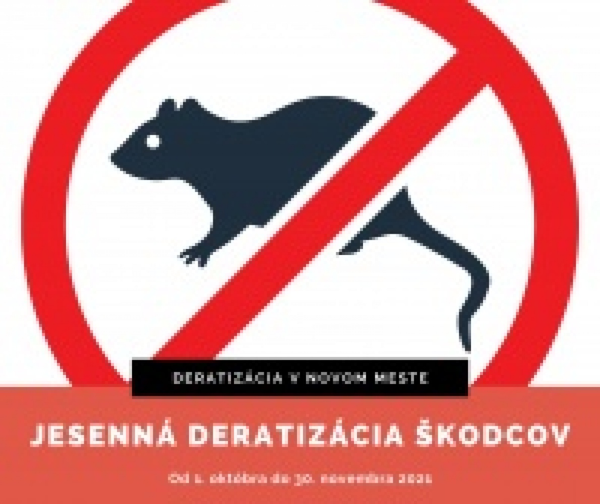 26.09.2022 - Mestská časť Bratislava – Nové Mesto oznamuje, že na základe výzvy Regionálneho úradu verejného zdravotníctva Bratislava bude v termíne od 1. októbra do 30. novembra 2022 uskutočnená celoplošná jesenná deratizácia s cieľom regulácie živočíšnych škodcov. Deratizáciu verejných priestranstiev v našej mestskej časti zabezpečíme prostredníctvom odborne spôsobilej firmy.