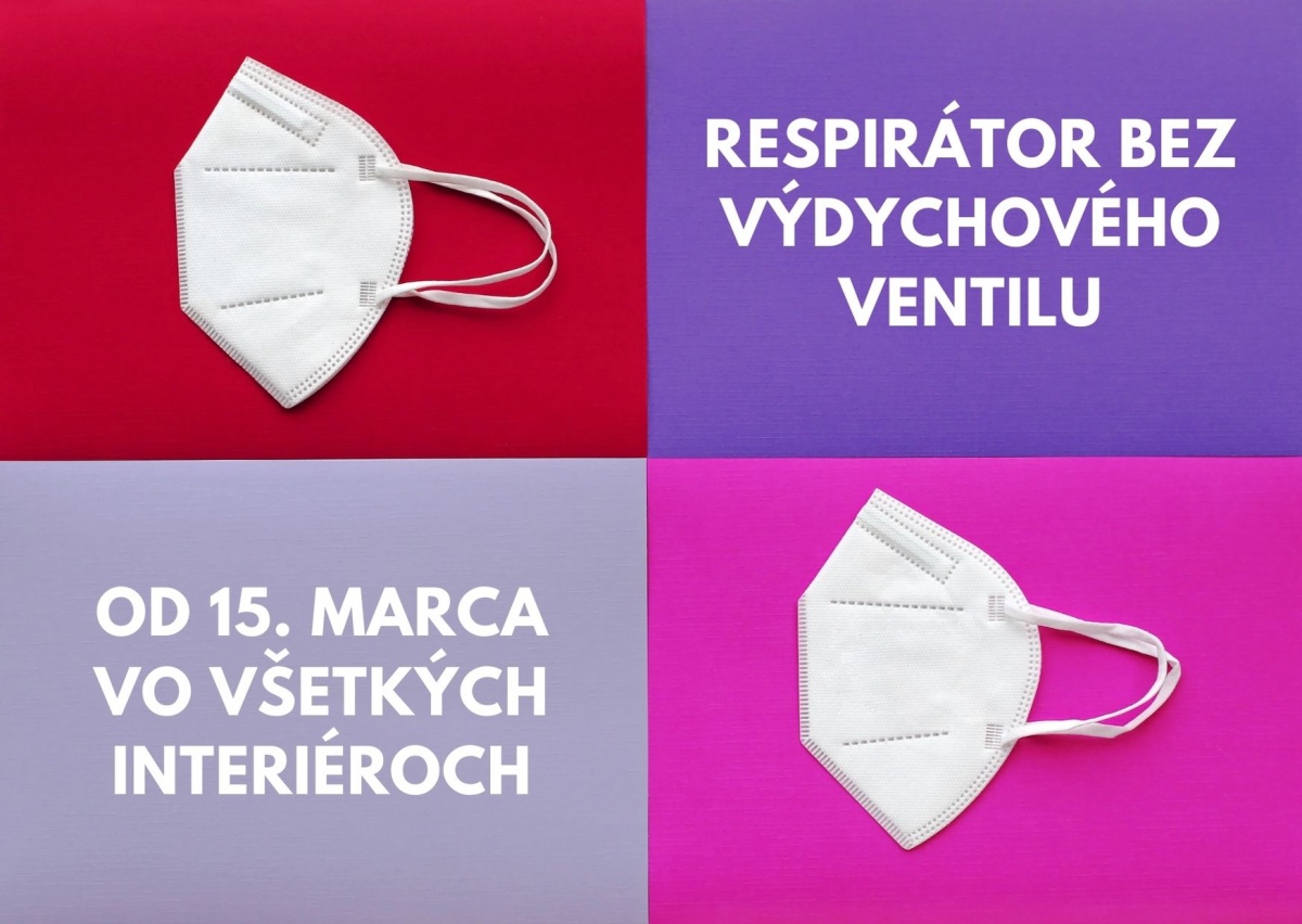 15.03.2021 - Pozor, od dnešného dňa 15. marca je povinné nosenie respirátorov bez výdychového ventilu, ktorý spĺňa klasifikáciu najmenej FFP2 (podľa normy STN EN 149+A1) vo všetkých interiéroch, okrem vlastnej domácnosti.