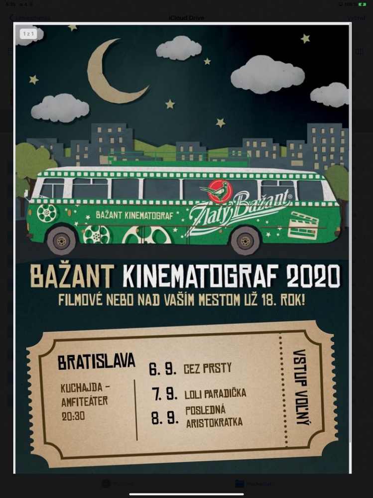 04.09.2020 - Ak máte radi kino na Kuchajde, prinášame vám tri bonusové projekcie! V spolupráci s projektom Bažant Kinematograf vám v dňoch 6. – 8. septembra 2020 premietneme tri filmy z tohtoročnej kolekcie slovenských a českých filmov v amfiteátri v príjemnom areáli Kuchajdy, kam ste už desať rokov zvyknutí chodiť na kvalitné filmy v rámci projektu Letné kino na Kuchajde.