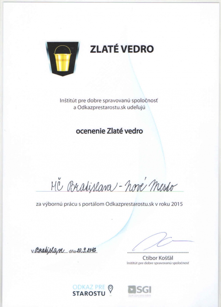 Inštitút pre dobre spravovanú spoločnosť a www.odkazprestarostu.sk udelila novomestskej samospráve ocenenie Zlaté vedro za výbornú prácu s týmto portálom v roku 2015. „Chceme oceňovať samosprávy, ktoré využívajú portál nielen v zmysle kvalitného a rýchleho riešenia podnetov, ale aj v komunikácii so svojimi obyvateľmi. Riešenie niektorých problémov je totiž časovo či finančne náročné a vtedy je veľmi dôležité, aby samospráva o svojom postupe s občanmi komunikovala,“ povedal koordinátor projektu Martin Kollárik.