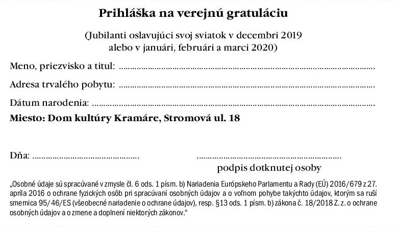 29.11.2019 - Aj v roku 2020 nás čakajú slávnostné stretnutia, na ktorých prejavíme úctu a vďaku skôr narodeným oslávencom. Z dôvodu nových predpisov na ochranu osobných údajov nemôže mestská časť osloviť jubilantov priamo. Ak vy, váš známy alebo rodinný príslušník budete v období od decembra 2019 do marca 2020 oslavovať okrúhle jubileum, teda 70, 75, 80, 85, 90 alebo viac rokov a máte trvalý pobyt v Novom Meste, vyplňte priloženú prihlášku: Prihláška na verejnú gratuláciu. Doručte ju na adresu: Stredisko kultúry, Vajnorská 21, 831 03 Bratislava (v prípade osobnej návštevy využite vchod z Českej ulice). Stredisko kultúry môžete kontaktovať aj na telefónnom čísle 0903 929 244 a na e-mailovej adrese jubilanti@skvajnorska.sk. K dispozícii je tiež odkazovač na telefónnom čísle 02/44 37 37 82, kde po vypočutí odkazu a zaznení tónu nadiktujte meno, priezvisko, adresu trvalého pobytu, dátum narodenia a my vám pozvánku na najbližšiu oslavu jubilantov s presným miestom, dátumom a časom konania pošleme poštou. Ďakujeme!