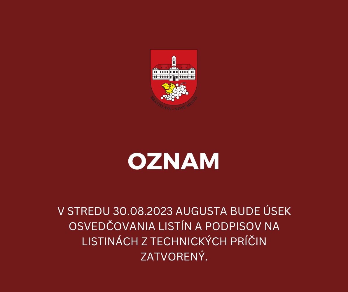 25.08.2023 - Miestny úrad Bratislava-Nové Mesto oznamuje občanom, že 30. augusta 2023 bude úsek osvedčovania listín a podpisov na listinách z technických príčin zatvorený.