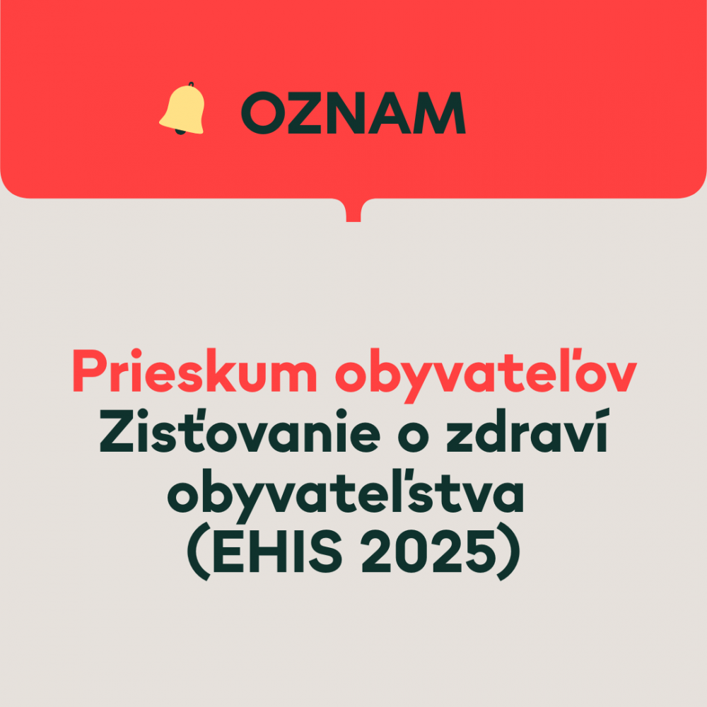 Štatistický úrad Slovenskej republiky oznamuje, že v období od 1. júla do 31. decembra 2025 bude v celej Slovenskej republike prebiehať Zisťovanie o zdraví obyvateľstva (EHIS 2025).
