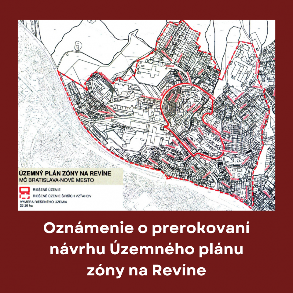 Mestská časť Bratislava-Nové Mesto, ako orgán územného plánovania a obstarávateľ územnoplánovacej dokumentácie, v súlade s platnou legislatívou oznamuje prerokovanie návrhu Územného plánu zóny Na Revíne, ktoré sa uskutoční v termíne od 14.10.2024 do 30.11.2024.