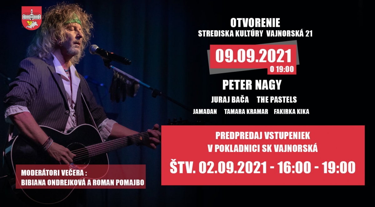 Vstupenky kúpite v sieti Ticketportal tu: https://www.ticketportal.sk/event/OTVORENIE-STREDISKA-KULTURY-VAJNORSKA-21?fbclid=IwAR1M54uieOqG5JF1InpCDx_GSom3FZ3bWR41K-lcswtW57MQgqRAqMtfmBc