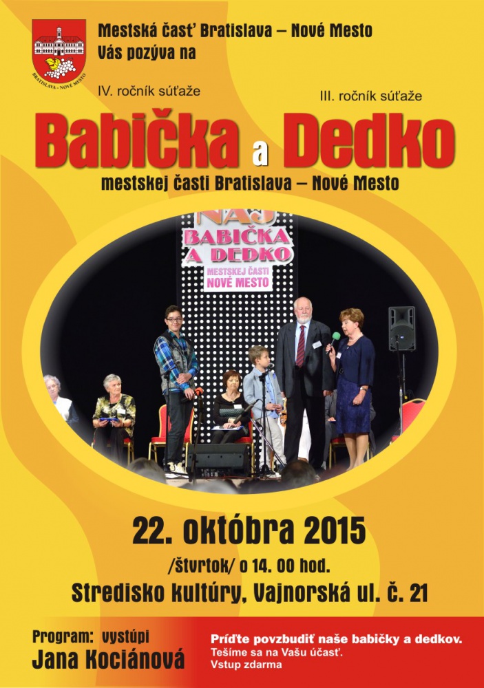 20.10.2015 - Mestská časť Bratislava – Nové Mesto vás pozýva na finále súťaže BABIČKA A DEDKO Nového Mesta 2015. Akcia sa uskutoční vo štvrtok 22. októbra 2015 o 14.00 hod.  v Stredisku kultúry na Vajnorskej ulici č. 21.