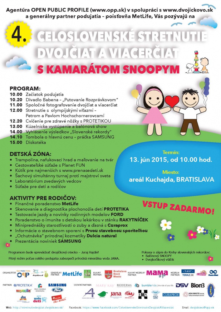 09.06.2015 - Bratislavské Nové Mesto bude hostiť v sobotu 13. júna 2015 rodiny s dvojčatami a viacerčatami z celého Slovenska. V poradí už štvrtý ročník jedinečného Celoslovenského stretnutia dvojčiat a viacerčiat s Kamarátom SNOOPYM sa uskutoční v areáli prírodného kúpaliska Kuchajda. Mestská časť Bratislava – Nové Mesto je hlavným partnerom podujatia.