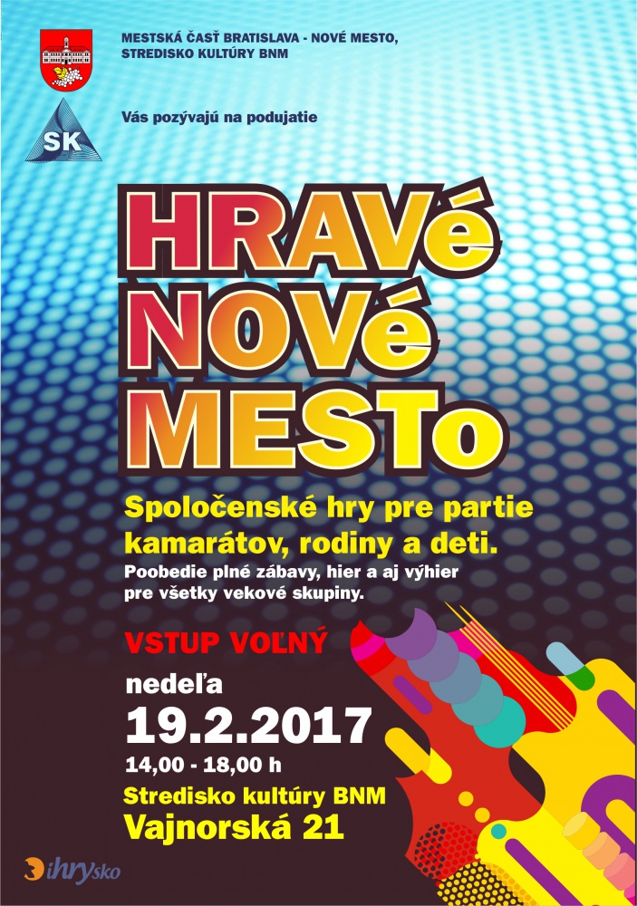 13.02.2017 - Mestská časť Bratislava – Nové Mesto a Stredisko kultúry Vajnorská vás pozývajú na popoludnie plné hier HRAVÉ NOVÉ MESTO.