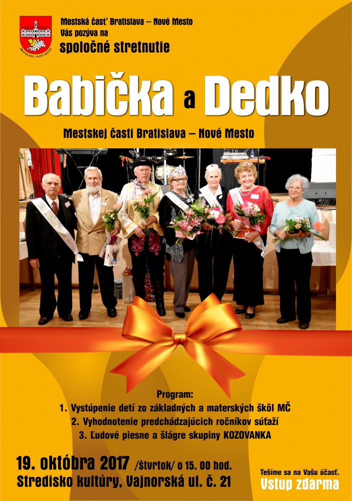 16.10.2017 - Mestská časť Bratislava – Nové Mesto vás pozýva na podujatie Babička a Dedko mestskej časti Bratislava – Nové Mesto 2017.