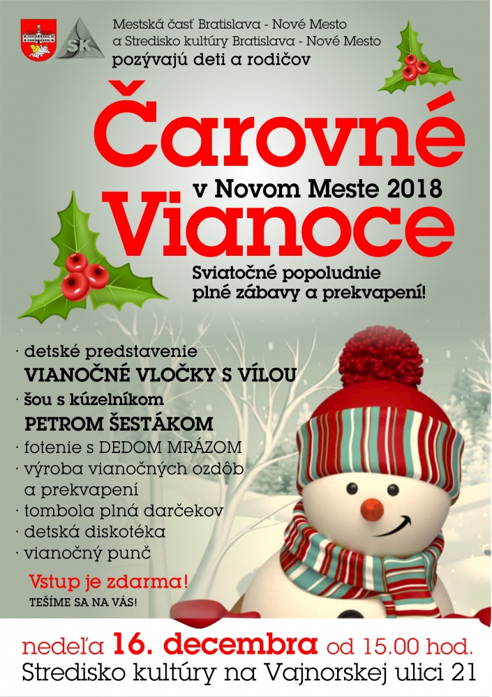 Pozývame vás na Čarovné Vianoce 2018 v Novom Meste. V nedeľu 16. decembra v Stredisku kultúry na Vajnorskej
