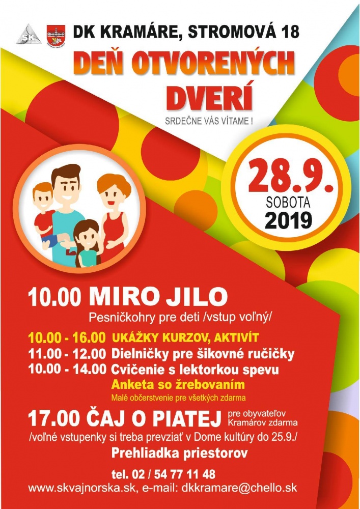 25.09.2019 - Máme pre vás tip na víkend – pre malých aj dospelých, pre celú rodinu. V sobotu 28. septembra vás pozývame na DEŇ OTVORENÝCH DVERÍ V DOME KULTÚRY KRAMÁRE. Najmenší sa zabavia s pesničkohrami pre deti s Mirom Jilom, či s kreatívnym kurzom Dielničky pre šikovné ručičky. Tí starší sa môžu prísť pozrieť na tradičné tanečné Čaje o piatej. Pripravené je aj malé občerstvenie. Tešíme sa na vás v sobotu od 10.00 hod. Vstup je zdarma.