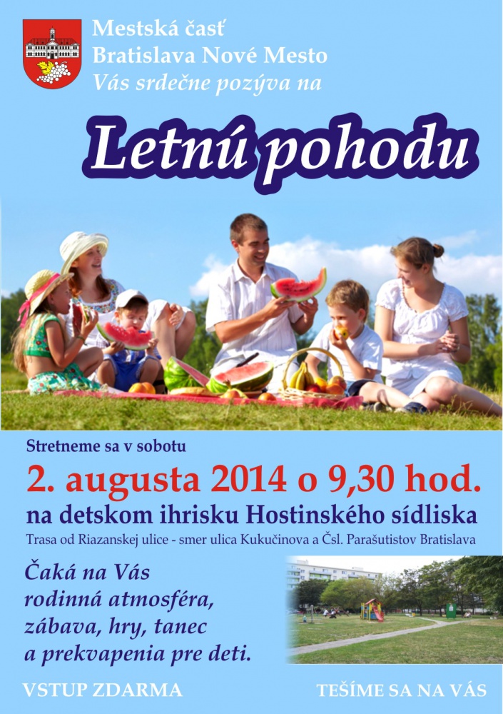 31.07.2014 - Mestská časť Bratislava - Nové Mesto pozýva Novomešťanov na LETNÚ POHODU. Strávte s nami 2. augusta príjemné sobotné dopoludnie na detskom ihrisku na Hostinského sídlisku. Čaká na vás rodinná atmosféra, kopec zábavy, detské atrakcie, hry, tanec a prekvapenia pre deti. Začíname o 9.30 hod.