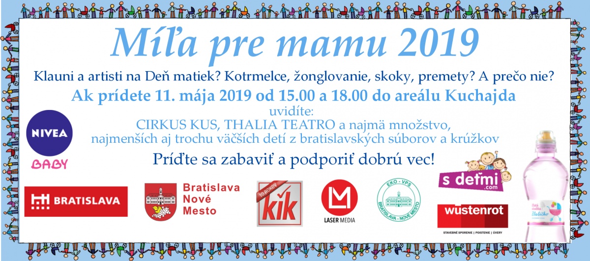 03.05.2019 - Pozývame vás na najväčšiu celoslovenskú oslavu Dňa matiek – MÍĽU PRE MAMU. Stretneme sa v sobotu 11. mája 2019 v areáli prírodného kúpaliska Kuchajda, akcia sa koná od 15.00 do 18.00 hod. Mestská časť Bratislava-Nové Mesto je partnerom podujatia.