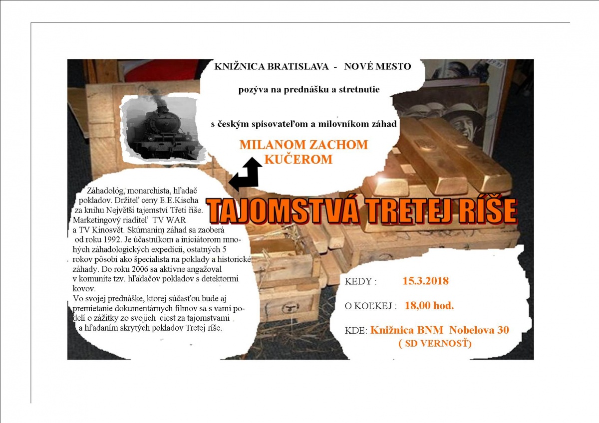 12.03.2018 - Knižnica Bratislava-Nové Mesto vás pozýva na prednášku "Tajomstvá tretej ríše" a stretnutie s českým spisovateľom a milovníkom záhad Michalom Zachom Kučerom.