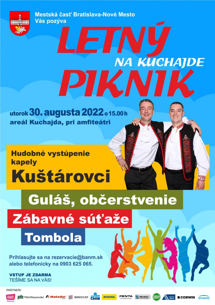 25.08.2022 - Na jar sme strávili veľmi milé a príjemné popoludnie s našimi seniormi – Jarný piknik na Kuchajde. Podujatie malo veľký úspech, čo nás veľmi teší. A preto by sme si to spolu s vami radi zopakovali už budúci utorok 30. augusta. Pozývame vás na Letný piknik na Kuchajde! Popoludnie nám spríjemnia ľudové a evergreenové piesne v podaní skupiny Kuštárovci a nebude chýbať občerstvenie a tombola. Príďte si s nami zasúťažiť, zaspievať alebo len tak posedieť v príjemnej spoločnosti. Tešíme sa na vás 30. augusta 2022 o 15.00 hod.