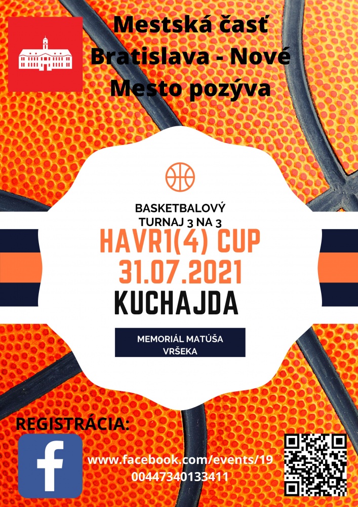 22.07.2021 - Milovníci streetballu, pozor! Pozývame vás na ďalší ročník tradičného turnaja Havr1(4) Cup, ktorý sa tento rok v s podporou našej mestskej časti Bratislava-Nové Mesto koná aj ako Memoriál Matúša Vršeka. Súťaž, ktorá sa hrá už od roku 2008, sa bude konať v sobotu 31. júla 2021 od 9.00 h na basketbalovom ihrisku v prírodnom areáli Kuchajda.