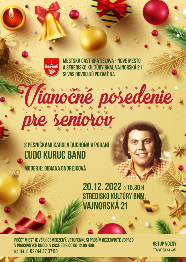 08.12.2022 - Mestská časť Bratislava-Nové Mesto a Stredisko kultúry Bratislava-Nové Mesto si Vás dovoľujú pozvať na Vianočné posedenie pre seniorov.