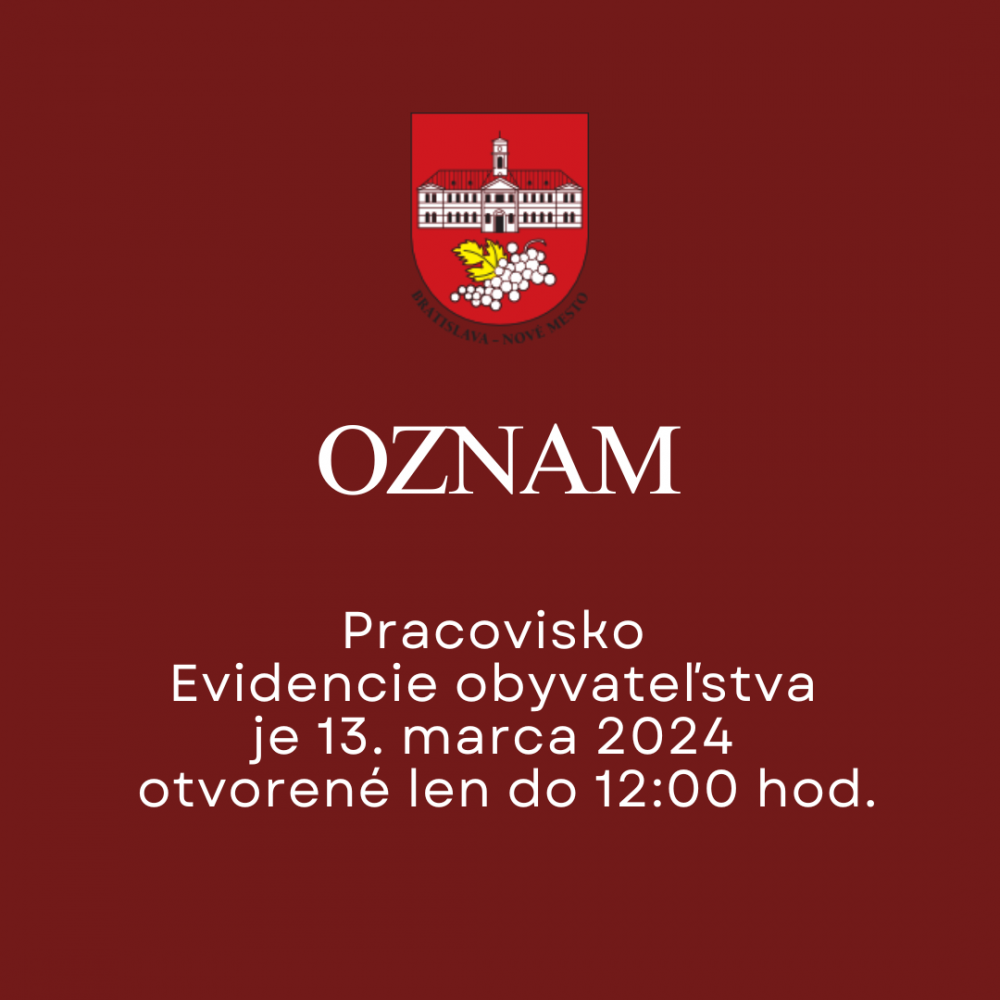 dovoľujeme si vás informovať o mimoriadnom skrátení otváracích hodín pracoviska Evidencie obyvateľstva Miestneho úradu Bratislava-Nové Mesto. Pracovisko bude 13. 3. 2024 z technických príčin otvorené len do 12:00 hod.