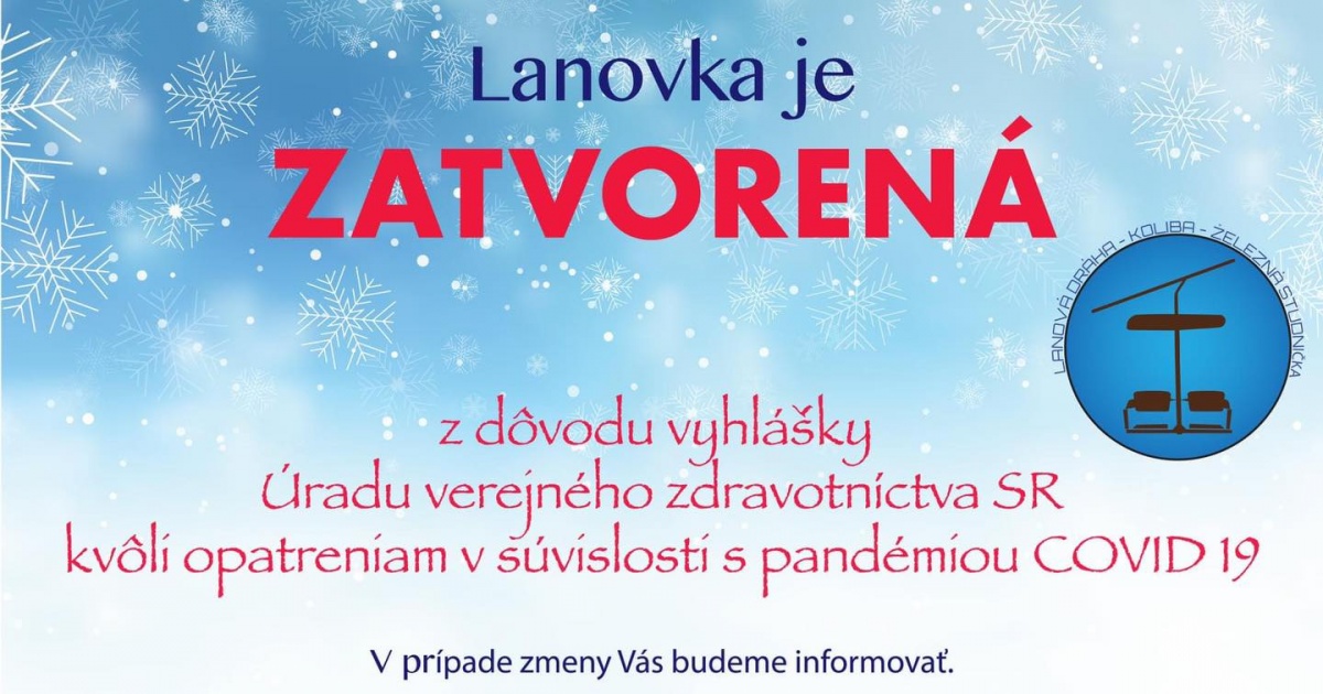 04.01.2021 - Lanovka Železná studnička - Kamzík je z dôvodu aktuálnych protipandemických opatrení zatvorená. O obnovení premávky vás budeme informovať. Ďakujeme za pochopenie.