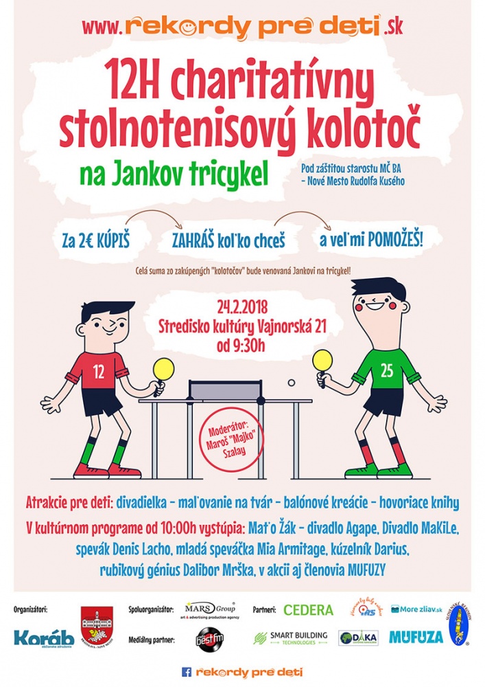14.02.2018 - Mestská časť Bratislava - Nové Mesto vás pozýva na 12-hodinový charitatívny stolnotenisový kolotoč, ktorý sa bude konať v sobotu 24. februára 2018 v Stredisku kultúry na Vajnorskej 21 od 9:30 hod.