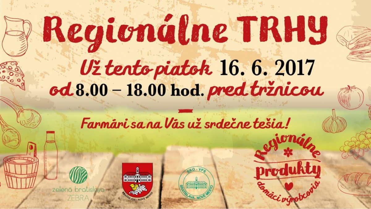 05.06.2017 - Mestská časť Bratislava - Nové Mesto vás pozýva na prvé REGIONÁLNE FARMÁRSKE TRHY, ktoré pokračujú aj v piatok 16. júna 2017 pred Novou Tržnicou na Trnavskom Mýte od 8.00 do 18.00 hod.