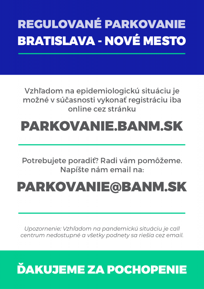 05.01.2021 - Registrácia Novomešťanov do systému regulovaného parkovania v pilotnej zóne Tehelné pole prebieha aj počas lockdownu. Vzhľadom na aktuálnu epidemiologickú situáciu a s ňou súvisiace opatrenia a obmedzenia je však možné vykonať registráciu iba online cez stránku http://parkovanie.banm.sk. Kontaktné miesta na Miestnom úrade na Junáckej ulici č. 1 sú až do odvolania pre verejnosť zatvorené.