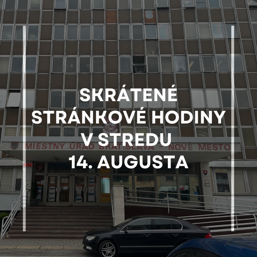 stránkové hodiny na Miestnom úrade Bratislava-Nové Mesto sú v stredu 14. augusta 2024 skrátené do 13:30 hod. Podateľňa zostáva otvorená do 16:00.