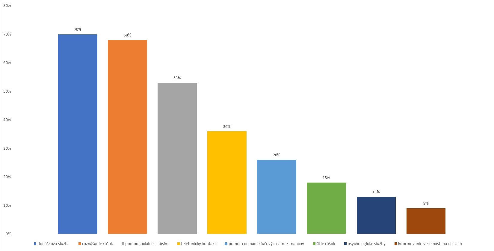 Väčšina ľudí prejavila ochotu pomáhať vo viacerých činnostiach. Neraz to znamená nielen vynaloženie času a práce, ale aj využitie vlastného auta či pokrytie materiálnych nákladov. Príjemne prekvapil vysoký podiel ľudí, ktorí prejavili ochotu finančne či hmotne pomôcť ľuďom, ktorí sa ocitli v núdzi – takých je až 53 % dobrovoľníkov!