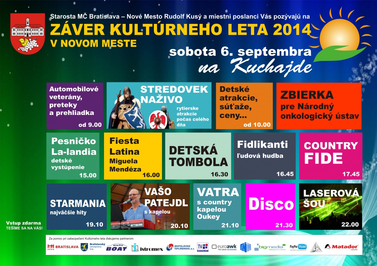 25.08.2014 - Stredovek naživo, preteky veteránov, detské atrakcie, Vašo Patejdl, laserová šou. Bratislavské Nové Mesto sa bude lúčiť s letom vo veľkom štýle. V sobotu 6. septembra sa v areáli prírodného kúpaliska Kuchajda uskutoční jedno z najväčších podujatí roka v mestskej časti – Záver Kultúrneho leta 2014 v Novom Meste.