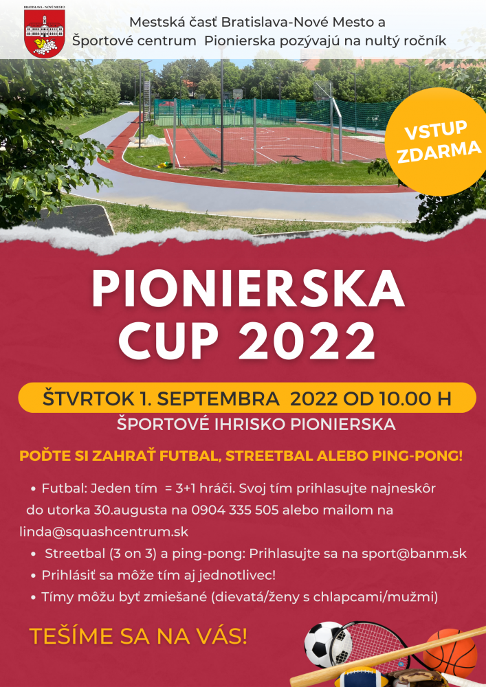 25.08.2022 - Športovci, pozor! Ak máte radi streetbal, futbal či stolný tenis, príďte si s nami zahrať budúci týždeň vo štvrtok 1. 9. 2022 na naše nové športové ihrisko na Pionierskej ulici! Zorganizovali sme pre vás nultý ročník Pionierska cup 2022. Prihlásiť sa môžete ako jednotlivec alebo spolu so svojim tímom. Nebude chýbať občerstvenie a dobrá nálada. :-)